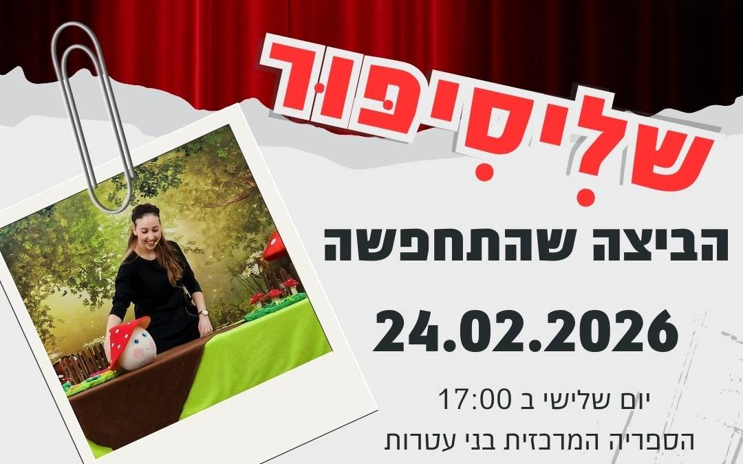 "שליספור" פברואר הצגות ילדים יום ג' בשעה 17:00 בספרייה הראשית (בני עטרות) יום שלישי, 24/02/2026 17:00 ספרייה אזורית, בני עטרות, ישראל לפרטים נוספים
